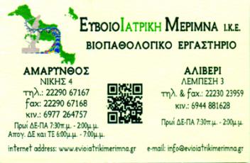 customer tabsΕπικοινωνία2. Νίκης 4, Αμάρυνθος (Ευβοιατρική Μέριμνα), τηλ:2229061767, φάξ: 2229067168Πρωί ΔΕ - ΠΑ 07:30-14:00Απογ. ΔΕ και ΤΕ 18:00-19:003. Λεμπέση 3, Αλιβέρι (Ευβοιατρική Μέριμνα) τηλ& φάξ: 2223023959mariapapa@gmail.comΠρωί ΔΕ - ΠΑ 07:30-14:00Site:http://www.evioiatrikimerimna.gr/E-mail: info@evioiatrikimerimna.grΜικροβιολόγοι - ΒιοπαθολόγοιΥγείαΚριεζώτου 48, ΚάρυστοςΚΑΡΥΣΤΟΣ ΕΥΒΟΙΑΣΑΛΙΒΕΡΙ ΕΥΒΟΙΑΣΑΜΑΡΥΝΘΟΣ ΕΥΒΟΙΑΣΕΥΒΟΙΑΣΤΕΡΕΑ ΕΛΛΑΔΑ 2224029081 2229067167 6977264757 694488162822290671682223023959info@mariapapa.grmariapapa@gmail.commariakapa48@gmail.cominfo@evioiatrikimerimna.grwww.biolabskarystou.grwww.evioiatrikimerimna.gr Το προτείνω (έχει προταθεί 0 φορές) ΦωτογραφίεςFacebook LikeShare on FacebookTweet Widget